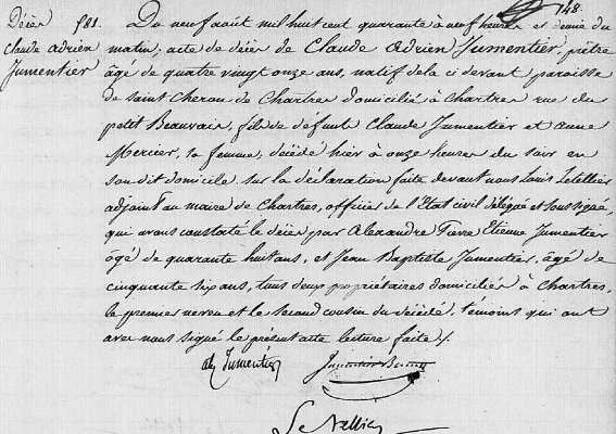 – L’abbé Claude-Adrien JUMENTIER (1749-1840), vicaire épiscopal, député suppléant du Clergé pour le bailliage de Chartres aux États généraux de 1789, qui fut l’un des fondateurs de la bibliothèque municipale de Chartres dont il fut conservateur et président. Sa tombe est ornée d’un beau médaillon en bronze par Henri Parfait.