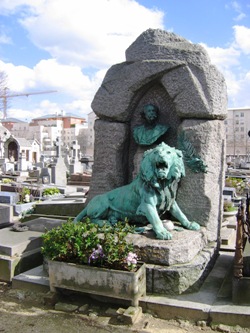 Dans le cadre d’un projet photo sur les monuments aux morts dédiés aux forains et les tombes de familles circassiennes, j’ai eu l’occasion de visiter la tombe Rancy au cimetière d’Asnières, il y a quelques jours. Le lion de bronze a disparu, la gardien m’a dit qu’il avait été volé il y a 3 ou 4 ans. Il ne reste plus que le buste, ainsi que le fouet et la pique en bronze incrustés dans la pierre tombale.