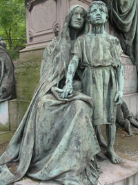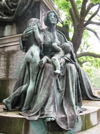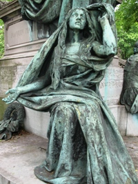 Voilà ce qu’on peut lire sur les guides d’art anciens, que recopient de nombreux sites sans discernement : "Mausolée décoré aux quatre angles de statues de femmes assises, en marbre, à savoir la Résignation, les yeux levés vers le ciel, a dans ses mains une banderole sur laquelle est écrit : Fiat volvntas tua, l’Ame, ayant une flamme au front, pose la main droite sur son cœur et tient de la main gauche un flambeau renversé, la Charité, voilée, s’apprête à laisser tomber une pièce de monnaie dans un tronc placé près d’elle, la Religion , qui a sur son genou un livre posé verticalement qu’elle désigne de la main droite".