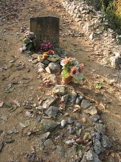 Tout en bas du cimetière, à quelques mètres de la tour en ruine, se trouve un petit monticule de terre décoré de quelques fleurs en plastique :