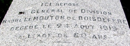 – Au fond du cimetière, deux tombeaux plus imposants attirent le regard : dans celui de droite repose le général Raoul Le MOUTON de BOISDEFFRE (1839-1919).
