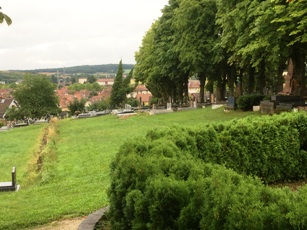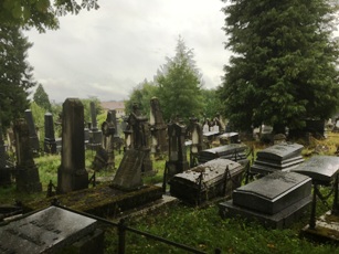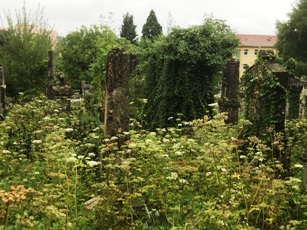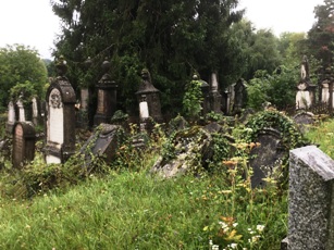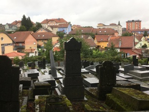 Ici, les noms ashkénazes dominent assez naturellement. Les parties les plus anciennes sont envahies par la végétation. Au loin les toits rouges de la ville que le cimetière, en altitude, domine.