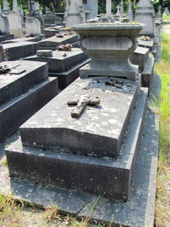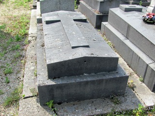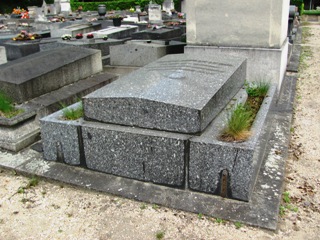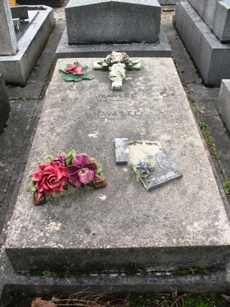 Alfred JARRY (1873-1907), fut inhumé. L’existence de sa tombe est problématique : on lit à peu près partout que sa tombe, non renouvelée, a désormais disparu. On sait, grâce à une souscription faite par le Mercure de France [3], où elle se trouvait avec précision : 23ème division, 5ème ligne, 5ème place. Si on se rend à cet endroit, on trouve une tombe anonyme dans un triste état, mais qui ne semble pas avoir bougée depuis bien longtemps. Il y a quelques années, Vincent de Langlade amenait ses visiteurs sur cette tombe en la présentant comme celle de Jarry… Dès lors, que penser ? Cet espace délabré n’est-il pas tout simplement la tombe de Jarry, qui si elle ne fut pas renouvelée, n’en fut pas moins laissée… Si un visiteur du site à plus d’info…