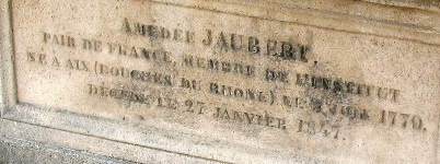 Il repose dans la 45ème division, dans le tombeau Jaubert, sépulture de Pierre-Amédée JAUBERT (1779-1847), orientaliste et traducteur qui servit d’interprète à Bonaparte lors de la campagne d’Egypte. Il fut en outre membre de Académie des inscriptions et belles-lettres, professeur de persan au Collège de France, professeur de turc à l’École des langues orientales, dont il devint président en 1838. Il fut nommé pair de France et conseiller d’État en 1841.