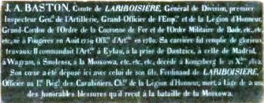 Jean Ambroise BASTON de LARIBOISIÈRE [1] (1759-1812) entra jeune dans l’armée et servit avant la Révolution dans le même régiment d’artillerie que Napoléon Bonaparte. Il participa aux campagnes de la Révolution et du Consulat, toujours comme artilleur, accédant au grade de général de brigade en 1803. Assez naturellement, il fut un acteur majeur des campagnes impériales : Austerlitz, Iéna, Eylau, puis devant Dantzig où il fut blessé par un boulet… Il eut l’honneur de diriger sur le Niémen la construction du radeau sur lequel Napoléon Ier et le tsar Alexandre Ier se rencontrèrent en prélude à la paix de Tilsit.
