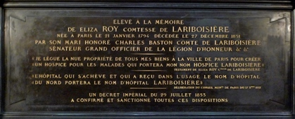 Elisa ROY LARIBOISIÈRE (1792-1851) était la fille du richissime comte Antoine Roy, ministre des Finances de la Restauration. Elle eut une vie sociale bien remplie, tenant salon littéraire et s’occupant sans ostentation d’œuvres sociales. Elle mourut sans descendance et laissa par testament la plus grande partie de sa fortune pour la fondation d’un hôpital à Paris [3](2 600 000 F or, soit le quart du coût total de l’hôpital). Cet hôpital, élevé conformément à sa dernière volonté, était l’un des plus beaux de Paris à son époque et reçut le nom d’Hôpital Lariboisière.