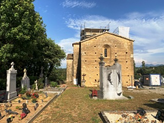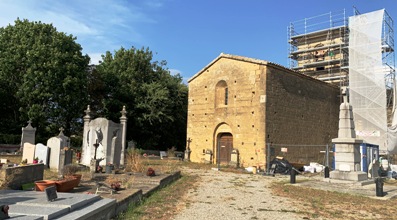 Située dans la plaine, en contrebas du village perché de Chabrillan, le cimetière communal, de taille modeste, s’est développé autour de la vieille église Saint-Pierre. Il s’agit d’un édifice d’art roman dont la construction s’est échelonnée sur plus d’un siècle, du XIème au XIIème siècle. Classée monument historique en 1862, elle possède un bel ensemble de chapiteaux romans représentant des sujets allégoriques. Seul l’extérieur était visible lors de ma visite, en raison de de travaux de sécurisation de l’intérieur de l’église.