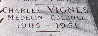 Libération Charles VIGNES (1905-1951). Médecin militaire, il servit en Indochine de 1933 à janvier 1938, puis fut désigné pour servir en Afrique équatoriale française. Il était au Tchad lors de l’armistice et de son engagement dans la Résistance. Il prit part à la campagne d’Érythrée, participa à la campagne de Syrie puis fut nommé médecin-chef du Groupe sanitaire divisionnaire de la 1re Brigade française libre commandée par le général Koenig. Après El Alamein, il participa à la campagne de Tunisie, débarqua en Italie, puis en Provence, avant de faire la campagne de France. Il repose dans la sépulture familiale auprès de son père, Maurice VIGNES (1868-1943), doyen de la faculté de Droit de Dijon et auteur de plusieurs ouvrages d’économie politique.