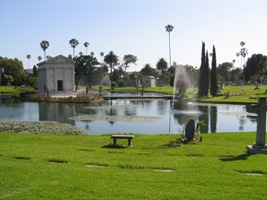 Le cimetière se présente donc sous la forme d’un vaste espace vert arboré sur lequel on trouve un lac artificiel. On y pénètre par le boulevard Santa Monica.