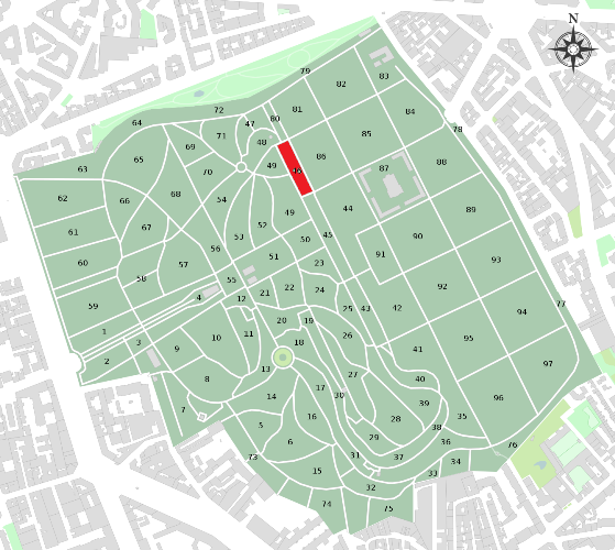 Petit division composée de 4 lignes, elle se trouvait aux confins de la partie ancienne du cimetière : elle fut donc occupée par des concessions temporaires, parfois transformées en perpétuelles. Cela explique le nombre de vieux tombeaux, certains consignés dans les vieux guides du cimetière, dont quelques uns sont toujours là. Beaucoup de dalles devenues illisibles recouvertes par la mousse, mais peu de personnalités notables. Faisons en vite un relevé avant qu’elle ne soit l’une des prochaines à subir des reprises massives, ce qui ne saurait tarder.