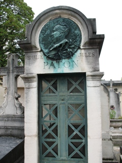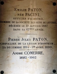 italien Antonio Pacini (qui repose dans ce même cimetière, dans la division 48), elle se fit connaître en publiant des chroniques et articles sur les beaux-arts sous un le pseudonyme Jacques Rozier (du nom de sa mère). Elle publia ensuite plusieurs romans, dont Le Divorce de Sarah Moore qu’elle adapta pour le théâtre. Elle repose avec son époux, le chroniqueur financier français Jules PATON (Jules Fleurichamp : 1817-1890). Sa chapelle est ornée d’un médaillon en bronze par Jacqueline Comerre-Paton, sa fille, qui repose dans cette même division avec son époux.