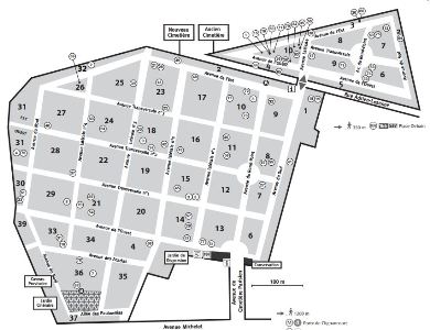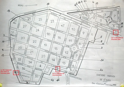 – le plan "officiel" : bienvenue chez Ubu ! Pendant longtemps, on y distribuait un plan totalement fantaisiste, où aucune mise à jour n’avaient été faites. Depuis, un nouveau plan officiel a vu le jour, reprenant l’ensemble des personnalités retrouvées par mes soins et contenu dans cet article, qui en a donc été le modèle (on peut le trouver sur le Net). On aimerait à penser qu’il va être une aide précieuse, mais ce serait une erreur. J’ignore qui en est l’auteur, mais il n’y a pas de quoi le remercier : la quasi totalité des localisations est totalement fausse, vous amenant parfois à l’extrémité inverse du lieu où se trouve la tombe. Certaines ne sont même pas placées dans la bonne division. En outre, d’un plan à l’autre, certaines divisions ont disparu (la 5, la 38...) alors qu’elles existent toujours. Pour mieux comprendre, je joins le plan actuel du cimetière avec sa version antérieure de trente ans.
