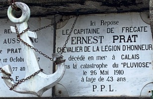 – Le capitaine de frégate Ernest Prat victime de la catastrophe du Pluviôse à Calais le 26 mais 1910. Il y avait à peine cinq ans que les sous-marins existaient quand le ministre de la Marine, Camille Pelletan décida la création à Calais d’une flottille sous-marine. Opérationnelle, elle réunit trois unités. L’une d’elles, le Pluviôse, appareilla le 26 mai 1910 pour des exercices au large, dont un simulacre d’attaque de navire. Le paquebot Pas-de-Calais venait de sortir des jetées quand il éventra accidentellement le sous-marin, qui disparut avec ses vingt-sept occupants. Aucun ne survécut. Le président de la République Armand Fallières assista aux funérailles des victimes, suivies par une foule considérable. Je retrouve régulièrement tout autour de la France des victimes de ce drame.