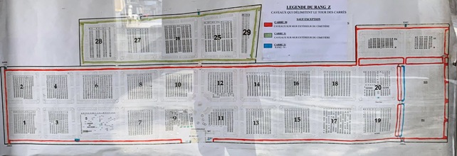 A l’entrée, une borne permet de localiser rapidement les sépultures recherchées. Le carré 30 est en réalité constitué de toutes les tombes qui s’alignent tout autour du cimetière contre le mur d’enceinte.