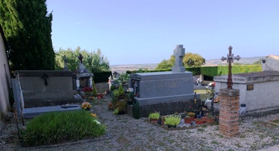 Le cimetière présenté ici n’est pas celui du bourg de l’Isle Joudain, mais celui du hameau de Cassemartin. Il s’agit d’un minuscule cimetière autour de son église, dominant le paysage environnant.
