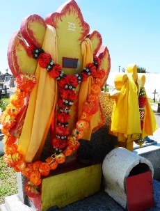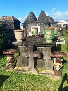 ceux-ci pratiquaient le double culte. A partir des années 1970, les Indiens ne voulurent plus cacher leur croyance religieuse. Sur les tombes, les couleurs vives et des signes ostentatoires firent progressivement leur apparition, témoignant de leur appartenance culturelle hindouiste. Surplombant les tombes hindoues, le trident en hommage au dieu Shiva se dresse, d’un jaune vif presque aveuglant à la lumière du soleil. Colliers de fleurs, foulards colorés, symboles hindous s’affichent sur les tombes.