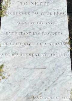Toinette Atis-Rilo – une esclave affranchie – fut enterrée au Cimetière de l’Est. Sa tombe de marbre blanc est entourée de tombes d’hommes et de femmes libres. Quelques documents nous permettent d’en savoir un peu plus sur elle : cette « ?esclave noire créole d’1m50 aux cheveux crépus ? » serait née vers 1798, et originaire de Sainte-Suzanne. Esclave de Jules Lory, arrivé à la Réunion en 1825, elle faisait partie d’un groupe d’esclaves présents dans les propriétés achetées par les Lory au Chaudron, en particulier une sucrerie. Elle devint la servante de Jules père, puis de Jules fils. Elle décéda en 1860. Son épitaphe est signée par ses deux anciens maîtres (famille Lory des Landes) : il faut passer le texte paternaliste pour aller vers le fait que les deux propriétaires imposèrent la présence d’une femme noire, ancienne esclave, dans un espace réservé à la bourgeoisie blanche. Cela n’efface pas la mise en esclavage mais montre qu’elle a su dans cette période créer un cadre qui humanise celle-ci aux yeux de ses maîtres, les amenant à transgresser les codes sociaux de leur époque. Cette situation particulière montre qu’elle faisait sans doute partie des nénènes, mères nourricières des enfants du maître. Du fait de l’importance de cette tombe unique, des panneaux explicatifs furent placés à proximité de sa tombe en décembre 2021.