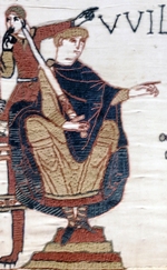 Guillaume le Conquérant (ca1027-1087) fut duc de Normandie, sous le nom de Guillaume II, de 1035 à sa mort, et roi d’Angleterre, sous le nom de Guillaume Ier, de 1066 à sa mort. Après une période de forte instabilité, il parvint à reprendre la domination du duché à partir de la bataille du Val-ès-Dunes, en 1047, et fit de la Normandie un duché puissant, craint des rois de France Henri Ier (1031-1060) puis Philippe Ier (1060-1108). À la suite de la mort du roi Édouard le Confesseur, il profita d’une crise de succession pour s’emparer, après sa victoire à la bataille d’Hastings (1066), de la couronne d’Angleterre. Cette conquête fit de lui l’un des plus puissants monarques de l’Europe occidentale et conduisit à de très profonds changements dans la société anglaise, dont l’élite anglo-saxonne disparut au profit des Normands. Dès lors, il passa la suite de son règne à se défendre face à ses nombreux ennemis, que ce soit en Angleterre (les rebelles anglo-saxons rassemblés derrière Edgar Atheling, les Danois et les Écossais) ou sur le continent (le comte d’Anjou Foulques le Réchin, le comte de Flandre Robert Ier, et surtout le roi de France Philippe Ier). Avant de mourir, le duc-roi régla sa succession : il confia à son fils aîné Robert Courteheuse le duché de Normandie, tandis que son deuxième fils Guillaume le Roux reçut la couronne d’Angleterre. Il mourut le 9 septembre 1087 à Saint-Gervais de Rouen et choisit d’être inhumé dans le chœur de son église Saint-Étienne de Caen.