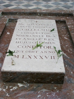 Le tombeau de Guillaume le Conquérant était placé au milieu du chœur (peut-être sous la tour-lanterne). Son fils, Guillaume le Roux, fit construire un monument en marbre, surmonté d’un gisant. En 1522, le mausolée fut ouvert une première fois sur ordre papal. Ce monument fut détruit en 1562 par les huguenots, qui exhumèrent la dépouille, la mirent en pièces, et dispersèrent ses os : seul son fémur gauche aurait été sauvé par le poète Charles Toustain de La Mazurie. La relique fut placée dans un nouveau tombeau en 1642, qui fut remplacé au XVIIIe siècle par un monument plus élaboré, lequel fut détruit en 1793, pendant la Révolution française. Elle fut remplacée en 1802 par la pierre tombale visible actuellement, sous laquelle on plaça le coffret contenant le fémur. L’épitaphe latine indique : « Hic sepultus est invictissimus Guillelmus Conquestor, Normanniæ Dux, et Angliæ Rex, hujus ce Domus, CONDITOR, qui obiit anno M . LXXXVII.