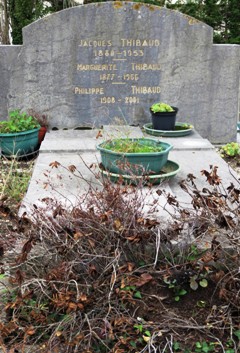 l’enseignement de Martin-Pierre Marsick aux côtés de Georges Enesco. Il débuta comme violoniste sous la direction notamment d’Édouard Colonne, avant d’entamer une carrière de soliste. Grand interprète de Mozart, il fut membre, avec le violoncelliste Pablo Casals et le pianiste Alfred Cortot, d’un trio de musique de chambre de réputation internationale. À côté de ses activités de concertiste, Jacques Thibaud se consacre également à l’enseignement . En 1943, il fonda, avec la pianiste Marguerite Long, le concours Long-Thibaud. Ami et disciple d’Eugène Ysaÿe, qui écrivit pour lui sa Deuxième sonate, Jacques Thibaud incarne aujourd’hui encore le violoniste français au jeu élégant et charmeur. Alors qu’il se rendait en Indochine en compagnie du pianiste René Herbin, son avion s’écrasa dans les Alpes occidentales. [section D, allée P9-3]
