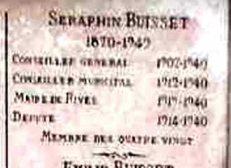 Au cimetière de Rives repose Séraphin BUISSET (1870-1949). Fils de paysan, il devint négociant en vins, adhéra à la SFIO et entreprit de briser le pouvoir des familles Kléber et Blanchet, puissants industriels qui se partageaient les fonctions politiques locales. Il fut élu député en 1914 puis maire de la commune en 1919. Il est constamment réélu jusqu’en 1940. Demeuré député jusqu’en 1940, il vota contre les pleins pouvoirs à Philippe Pétain le 10 juillet 1940, ce qui lui valut d’être révoqué de tous ses mandats par le Régime de Vichy.