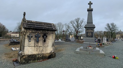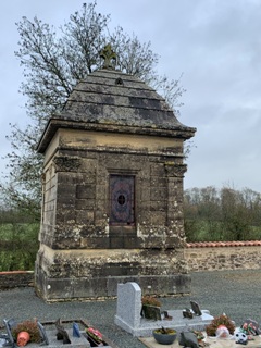 Au fond du cimetière, une grande chapelle est intrigante car son entrée tourne le dos à la nécropole : il me fallut contourner l’enclos (dans un champs bien boueux !) pour voir l’identité de son propriétaire, Henri De Brendenbeck de Châteaubriant (1832-1884). Il était l’oncle du prix Goncourt Alphonse de Châteaubriant, qui dans les années 40 fut le chantre de la collaboration. Condamné à mort par contumace, il s’enfuit et mourut en Autriche (il repose au cimetière de Kitzbühel). L’oncle Henri fut quant à lui maire du village, où il était propriétaire du château de la Motte.