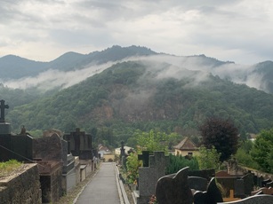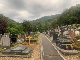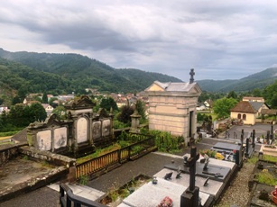 Si la commune est placée en fond de valle, entourée par des montagnes boisées du parc naturel régional des Ballons des Vosges ; son cimetière se situe à flanc de montagne. Lors de ma venue, après une averse mémorable, l’humidité remontant par évaporation donnait un cachet fantomatique au lieu.