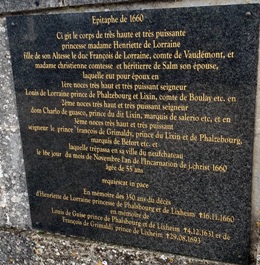 Henriette de Lorraine (1605-1660) : fille de François de Vaudémont, elle connut une existence tumultueuse. En 1621, elle épousa le fils de Louis de Guise, baron d’Ancerville, qui venait de recevoir les principautés de Phalsbourg et de Lixheim. Las de ses infidélités, le prince s’engagea dans les batailles aux côté du duc de Lorraine Charles IV et mourut en 1631 ; il fut inhumé plus tard à l’église Ste Lucie, à Sampigny. En 1635, des divergences profondes avec le roi Louis XIII et le Cardinal de Richelieu, obligèrent la princesse à prendre la fuite. Ruinée et en exil, elle jeta son dévolu sur un général d’artillerie, Dom Carlos Guasco, qu’elle croyait riche et l’épousa en 1649. Ce dernier mourut deux ans plus tard. En 1652, elle épousa François Grimaldi, seigneur Génois et banquier à Anvers. Cette alliance contribua à ramener le calme dans les États d’Europe. En 1659, Le couple regagna Sampigny où ils restaurèrent le château qui avait été pillé par les troupes françaises. A leur mort, Henriette et son dernier époux furent inhumés côte à côte à l’église de Ste Lucie. A l’entrée du cimetière, une plaque épitaphe rappelle son existence.