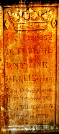 Débarqué au Chili le 28 août 1858, il gagna la province d’Arauco en 1860 où il promulga une constitution le 17 novembre. Ayant pris le nom d’Orellie-Antoine Ier (ou Orélie-Antoine Ier), il fut proclamé roi d’Araucanie et de Patagonie le 20 novembre 1860, revendiquant ainsi l’extension de son royaume au-delà des Andes, jusqu’à l’Atlantique et au détroit de Magellan. Il s’appuya sur les tribus Puelches et Tehuelches, hostiles au gouvernement chilien, mais fut fait prisonnier par les troupes chiliennes en 1862, puis condamné à l’internement dans un asile de fous. L’intervention du consul général de France lui permit de regagner la France. Durant la période 1860-1862, le Royaume d’Araucanie et de Patagonie eut donc, dans une certaine mesure, une existence effective. Il n’abandonna pas ses projets, organisa une souscription en 1866, et monta en 1869, 1874 et 1876 trois nouvelles expéditions qui se soldèrent par des échecs.