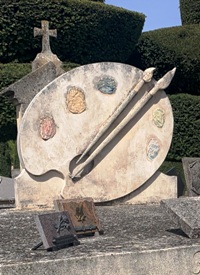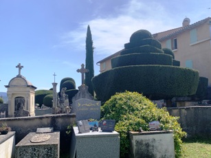 Il y a mille choses à voir dans le cimetière de Goult. Comme c’est souvent le cas dans ce type de région, aux vieilles familles provençales ont succédé des notables du monde des affaires, de la politique ou des sphères artistiques, qui finissent bien souvent au cimetière, parfois dans une grande discrétion. Leur aisance financière - mais aussi certaines sensibilités artistiques - autorisent souvent des tombeaux originaux, pas toujours très imposants, mais qui sortent de la banalité funéraire actuelle en mettant en avant la personnalité du défunt.
