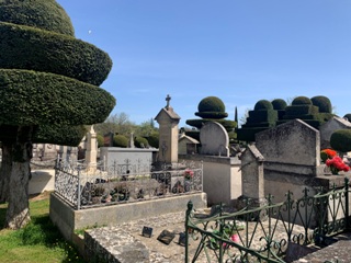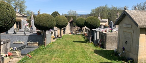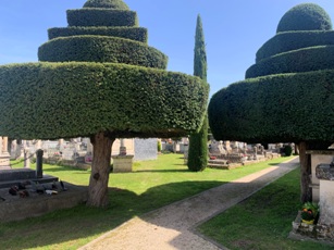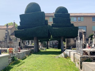 Ce cimetière se signale par son jardin d’ifs taillés en topiaires, pratique attestée depuis 1906. Les arbres, taillés impeccablement, donne au cimetière des allures de décor à un insolite pays des merveilles d’Alice !