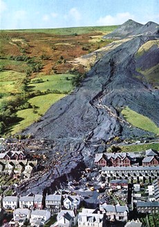 À 9 h 15 du matin, par un temps brumeux, le terril n°7 de la mine locale subit un glissement de terrain. Le câble du téléphone de l’équipe située en haut du terril ayant été volé, aucun signal d’alarme ne put être émis. Sur son passage, le glissement de terrain emporta un premier cottage dont les habitants furent tous tués. Vingt maisons furent détruites ainsi que l’école, la Pantglas Junior School, dont la majorité des élèves, 116 enfants, ainsi que 5 enseignants, furent tués. La catastrophe dura moins de 5 minutes.