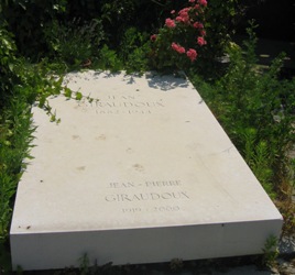 A l’origine, Jean Giraudoux fut inhumé au cimetière Montmartre dans un tombeau existant toujours (à l’entrée, sensiblement derrière le tombeau Guitry, mais son identité n’y est pas portée). C’est quelques temps plus tard qu’il fut transféré dans l’actuel caveau de Passy.