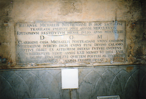 Aujourd’hui, dans cette même chapelle de l’église Saint-Laurent, on peut donc lire en majuscules romaines sur une plaque de marbre de la paroi : RELIQUIAE MICHAELIS NOSTRADAMI IN HOC SACELLVM TRANSLATAE FVERVNT POST ANNVM MDCCLXXXIX. EPITAPHIVM RESTITVTVM MENSE JVLII MDCCCXIII. Son épitaphe a été refaite au mois de juillet 1813.