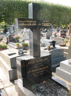 aux années 60 le maquilleur vedette du cinéma. Il participa effectivement à un très grand nombre de films, en particulier ceux d’Abel Gance (Napoléon, Austerlitz...), de L’Herbier, de Marc Allégret, de Grémillon… On lui doit les maquillages de Et Dieu créa la femme de Vadim, mais sa prestation la plus fameuse demeure la transformation de Jean Marais dans La belle et la bête. Dans le même tombeau repose le statuaire arménien Akop GURDJAN (1881-1948), dont on connaît plusieurs œuvres à Paris : le buste de Léon Tolstoï (dans le square qui porte son nom), ou la descente de croix sur la tombe Goukassow, dans la 97ème division du Père-Lachaise (2nde division).