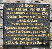 Il fut en un premier temps inhumé dans une tombe anonyme du cimetière Sainte-Catherine (aujourd’hui disparu) de Paris. Un appel aux dons fut lancé pour lui donner une sépulture plus décente. Un tombeau fut donc construit, mais il fut rapidement menacé par la désaffection programmée du cimetière. C’est en 1862 seulement qu’eut lieu le transfert vers le cimetière d’Arbois, d’où Pichegru était natif…Encore que de sérieux doutes demeurent quant à la dépouille qui se fit exhumer. Pour plus de détails sur les péripéties du corps de Pichegru, je renverrais tout simplement vers l’article concernant Pichegru sur le site de Marie-Christine Penin.