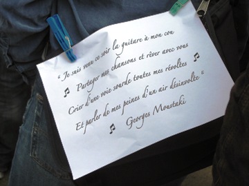 Ma future femme et moi-même l’avons rencontré au début des années 80 sur le pont qui relie l’ile de la Cité à l’ile Saint-Louis. Nous nous y étions arrêtés, un beau dimanche, pour écouter des musiciens des rues, les frères Amara, qui jouaient de l’orgue de Barbarie. Georges Moustaki, venant de l’ile Saint-Louis, où il devait habiter à l’époque (comme c’est rappelé par ailleurs), est alors arrivé au guidon de sa moto sur le siège arrière de laquelle était assise une très jolie fille. Il s’est arrêté pour discuter avec les frères Amara (des collègues !) et les a ensuite écoutés jouer, en notre compagnie. À la fin d’un morceau de musique, il s’est emparé de la casquette de l’un d’eux et nous l’a tendue pour qu’on y mette notre obole.
