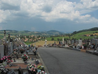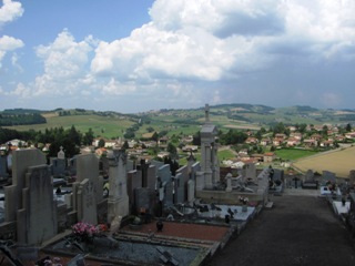 C’est derrière l’église, sur une pente donnant sur le paysage ondulé caractéristique des monts du Beaujolais, que se trouve le cimetière d’Amplepuis.