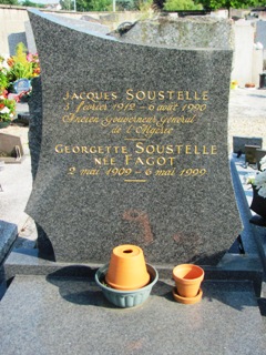 philosophie et ethnologue (il fut un spécialiste du Mexique et des cultures précolombiennes. Il fut en outre directeur du Musée de l’Homme), Jacques Soustelle rejoignit de Gaulle à Londres dès 1940. Après la Libération, il fut ministre (de l’information, puis des Colonies dans le gouvernement provisoire en 1945, à nouveau en 1958), secrétaire général du RPF, député du Rhône et gouverneur général de l’Algérie entre 1955 et 1956. Il participa au putsch d’Alger de 1958, qui contribua au retour au pouvoir du général de Gaulle. Partisan de l’intégration de l’Algérie à la France, il rejeta le principe de l’autodétermination. Contraint à l’exil en Italie de 1961 à 1968, il rentra en France à la faveur de l’amnistie de 1968 et fut élu à l’Académie française en 1983. Avec lui repose son épouse, Georgette SOUSTELLE (1909-1999), elle aussi ethnologue et spécialiste du Mexique, en particulier de certaines langues indigènes. Chercheuse au CNRS, elle créa un séminaire d’ethnologie du Mexique et de l’Amérique centrale à la Sorbonne.