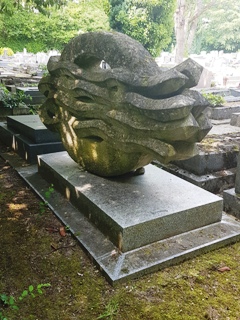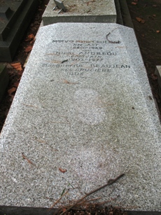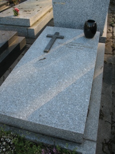 A l’ombre, dans un coin, un imposant objet d’art (Comme on dit dans Astérix), on pense à un gros poisson, ça doit faire deux tonnes et ça pèse sur la pierre tombale semblant empêcher un nommé Jacques Norval (1914-1998) de sortir !. Il doit s’agir du veuf d’une des célèbres sœurs coiffeuses Carita. (Auraient-elles osé lancer "Carita Tifs" ? J’en doute ! Ont été absorbées par l’Oréal, plus tard, après leur retrait et la cession au neveu. Deneuve et Dorléac sont coiffées par elles dans les films de Jacques Demy).