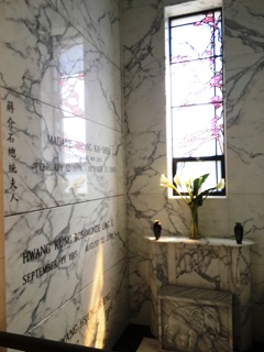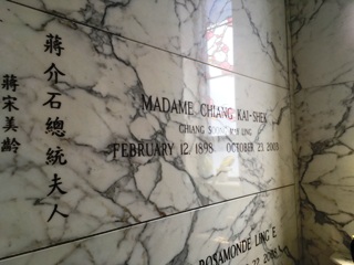 Kaï-chek, ce qui lui a valu d’être d’abord la première dame de la république de Chine, puis celle de Taïwan. Elle tint un rôle important dans l’histoire de la Chine pendant l’entre-deux-guerres et la Seconde Guerre mondiale, puis après-guerre à Taïwan. Ayant vécu longtemps aux États-Unis, anglophone — ce qui lui valut en son temps une célébrité médiatique en Occident — elle assista efficacement son mari dont elle fut la secrétaire, la conseillère, ainsi que l’interprète et l’ambassadrice auprès des Américains. Elle mourut à l’âge de 105 ans dans son appartement de Manhattan. Elle fut inhumée ici où reposent d’autres membres de sa famille. Le transfert de ses restes à Tzuhu, aux côtés de ceux de Tchang Kaï-chek, est prévu mais toujours reporté. Le couple avait de toute façon exprimé le désir d’être enterré en Chine dès que la situation politique le permettrait.