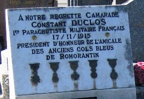 mousse. Cap-hornier à 14 ans, il survécut à une épidémie de peste qui décima l’équipage. Quand la Première Guerre mondiale éclata, il fut affecté au premier bataillon des Fusiliers Marins. Sa connaissance des cordages lui permit d’intégrer l’aéronautique en 1915. Il participa alors à un projet de parachute destiné à sauver la vie des aérostiers. Un prototype fut essayé par Constant Duclos le 17 novembre 1915 à 300 m d’altitude : ce fut le premier saut en parachute de l’histoire militaire française. Il lui fallut 4 minutes pour atteindre le sol. Le parachute fut homologué et la construction en série entamée. Constant Duclos fut ensuite envoyé en zone armée afin de convaincre les aérostiers d’utiliser ce nouvel outil. Il effectua alors vingt-trois descentes en parachute, établissant ainsi le record du plus grand nombre de sauts de la Première Guerre mondiale.