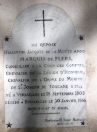 – Dans la chapelle de famille des La Motte-Ango de Flers repose en particulier Hyacinthe de FLERS (1803-1866). Aide de camp du maréchal Oudinot, puis vérificateur des archives de la Couronne et conseiller référendaire à la Cour des comptes en 1835, il fut condamné pour des articles contre la politique de Napoléon III dans des journaux étrangers et s’exile alors à Bruxelles. Il fut l’auteur de pièces de théâtre, représentées dans les théâtres parisiens. Petit-neveu du général Louis Charles de Flers, qui fut guillotiné en 1794, il épousa Elena Vitali, fille du comte Spiro Vitali, l’un de chefs de la Guerre d’indépendance grecque, qui repose avec lui. Ils furent les grands-parents du dramaturge Robert de Flers (les parents de ce dernier reposent également dans cette chapelle).