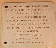 Le petit cimetière de Blanot se trouve juste derrière l’église Saint-Andoche. Celle-ci est visitée par des touristes du monde entier qui viennent voir le lieu où se serait produit un miracle le 31 mars 1331. Ce jour-là, au moment de la communion, une hostie serait tombée sur la nappe tendue par les fidèles et se serait transformée en sang. Après enquête des autorités catholiques, le pape Jean XXII a reconnu le miracle. Depuis lors, sauf durant la Révolution française, où elle fut cachée par des habitants pour éviter sa destruction, la relique s’est toujours trouvée dans l’église.