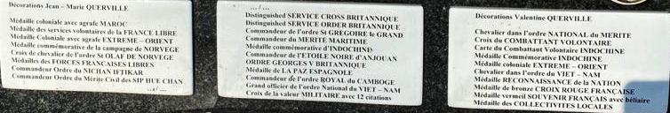 françaises libres. Commandant la Minerve, le Rubis et la Junon, il en fit une formation d’élite. Il fut chargé de surveiller les fjords sur les côtes de Norvège où se cachaient souvent croiseurs et cuirassés allemands. Il attaqua des bâtiments ennemis et transporta des résistants et des agents de renseignements, notamment le commando britannique et norvégien qu’il débarqua dans un fjord pour détruire une usine d’eau lourde, en septembre 1942. L’opération fut une réussite et il acquit une réputation de spécialiste des missions difficiles. En 1943, il fut affecté à l’État-major particulier du général de Gaulle et participa au débarquement de Normandie en juin 1944, commandant les escorteurs du groupe de débarquement américain « Chama » sur Omaha Beach. Faisant la navette entre la Grande-Bretagne et la France, il escorta 102 convois. Il prit part ensuite au blocus des poches de l’Atlantique. Il poursuivit sa carrière après la guerre, servit en Indochine, puis fut désigné commandant en chef des Forces maritimes françaises en Méditerranée. Il devient ensuite préfet maritime en Algérie. Il fut fait Compagnon de la Libération. Sa stèle reproduit ses très nombreuses décorations.