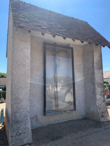 Dans le cimetière, un crucifix dans une alcôve protégée par une vitre semble attendre un bus improbable !