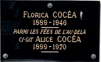 En ce lieu repose l’actrice d’origine roumaine Alice COCÉA (1899-1970). Elle commença sa carrière en 1918 dans un film de Jacques de Baroncelli, puis se tourna vers le théâtre et l’opérette et créa successivement deux opérettes légères d’Henri Christiné et Albert Willemetz, Phi-Phi en 1918 puis Dédé (avec Maurice Chevalier) en 1921. En 1926 elle épousa le comte Stanislas de La Rochefoucauld-Doudeauville, l’écrivain Colette étant son témoin. Elle joua dans plusieurs films quand le cinéma devient parlant. Profondément épris, l’explorateur Victor Point se suicida en sa présence au cours d’une promenade en barque en 1932. Pendant l’Occupation, elle dirigea le théâtre des Ambassadeurs, mais son attitude à l’égard des Allemands, pendant cette période, lui fut reprochée à la Libération. Elle se retira alors de la scène, puis elle réapparut au théâtre et dans quelques films jusqu’au début des années 1960. Sa sépulture, qu’elle partage avec sa sœur, a récemment été réhabilitée.