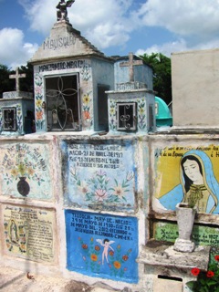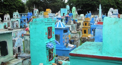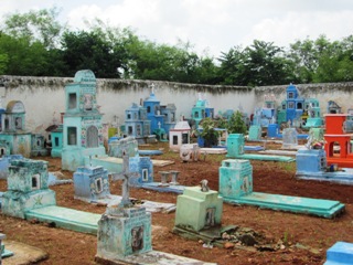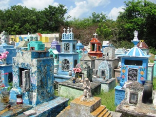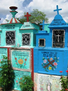 Les tombes sont presque toutes colorées et ont parfois la forme de niches, de maisons en paille traditionnelles du Yucatan, voire de façades d’églises, de pyramides antiques. Il y a même la tour latino-américaine de Mexico !