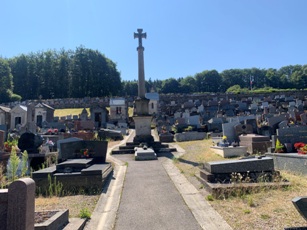 Le cimetière de Xertigny s’étage en paliers : en haut, vue plongeante sur la commune et la campagne.