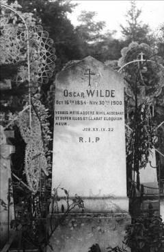 Il repose sous un étrange sphinx aîlé de l’américain Jacob Epstein. Le visage, vu de face, évoque les traits de l’écrivain à la fin de sa vie. Cette sculpture fut "interdite de séjour" durant six ans par le préfet de Seine en raison du sexe masculin apposé à cet ange, sexe mutilé en 1961 par un prude ou un collectionneur. On raconte qu’il servit un temps de presse-papiers au conservateur du cimetière. Depuis quelques temps, la tombe d’Oscar Wilde est couverte de traces de baisers faits au rouge-à-lèvre. En 1950, les cendres de Robert Ross (1869-1918), qui fut son exécuteur testamentaire mais surtout son amant le plus fidèle, furent placées dans sa tombe.